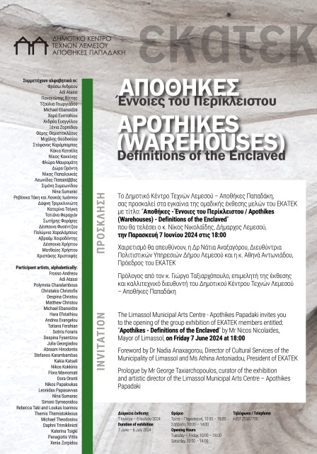 Παγκύπρια έκθεση μελών ΕΚΑΤΕΚ με τίτλο: «ΑποθήκεςΈννοιεςτουΠερίκλειστου» “Apothikes (Warehouses) – Definitions of the Enclaved” Επιμελητής: Γιώργος Ταξιαρχόπουλος, Διευθυντής του Δημοτικού Κέντρου Τεχνών Λεμεσού – Αποθήκες Παπαδάκη Εγκαίνια: Παρασκευή, 7/6/2024 και ώρα 18:00 Τα εγκαίνια θ...