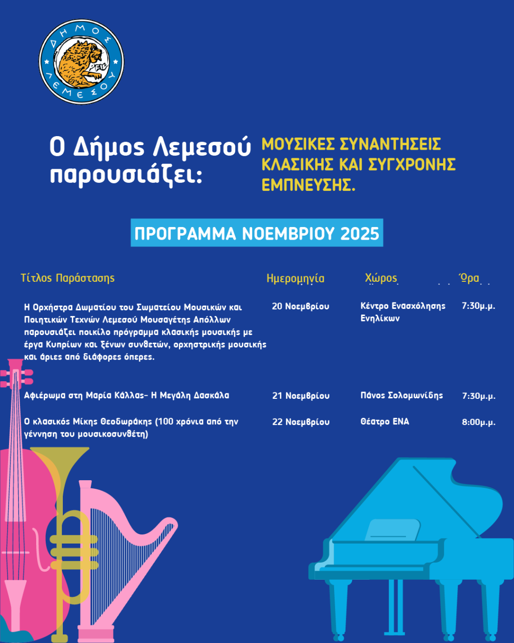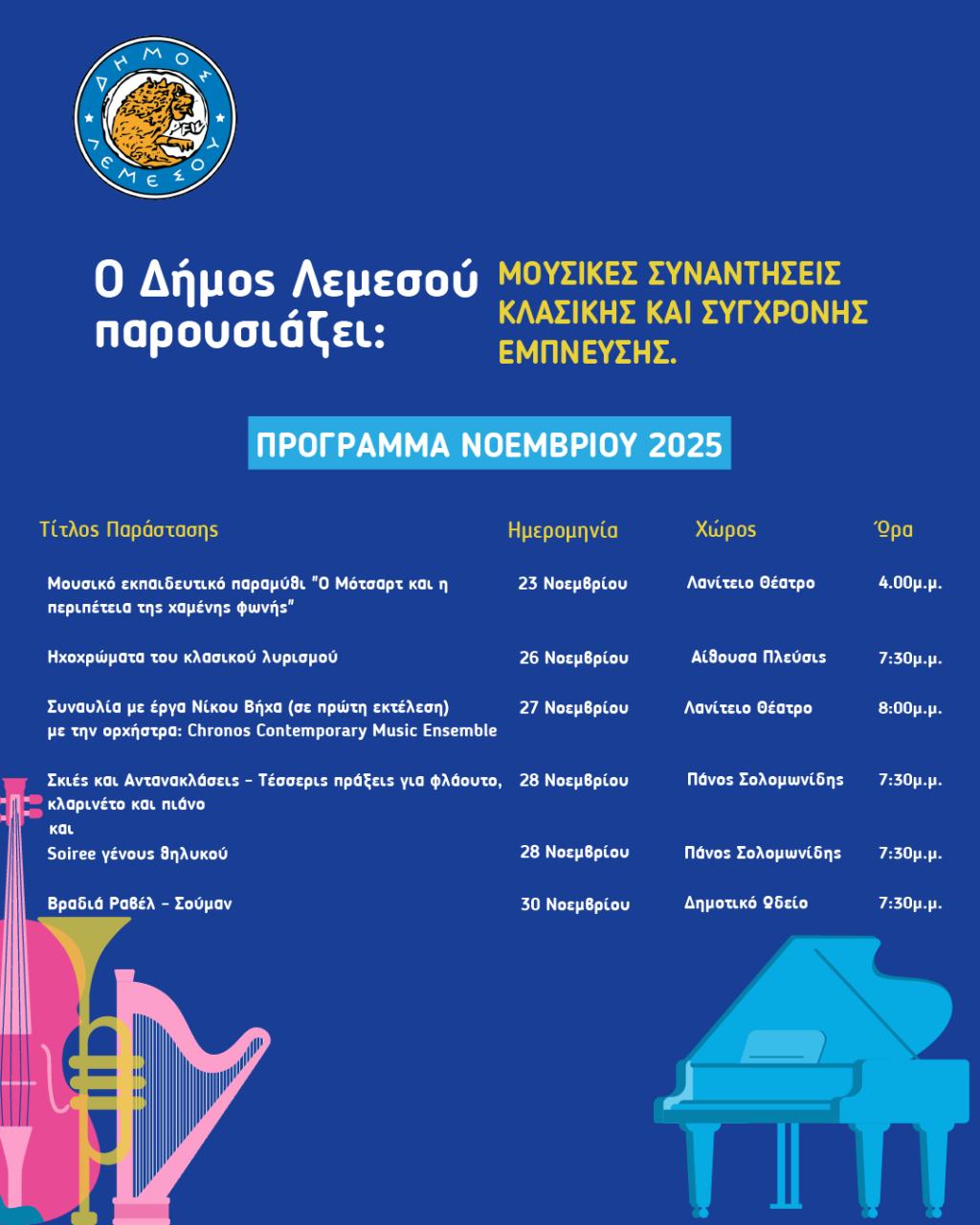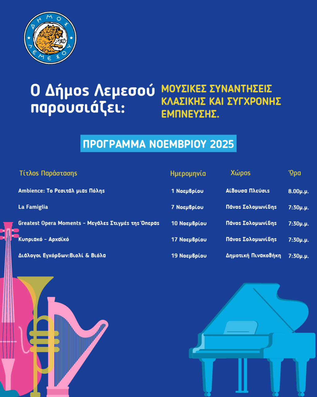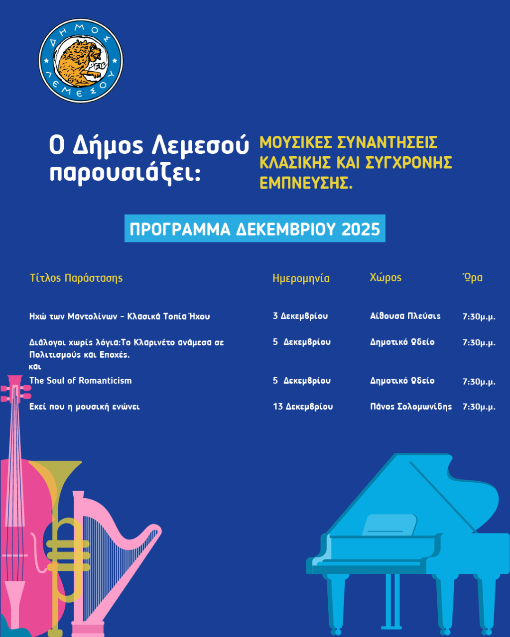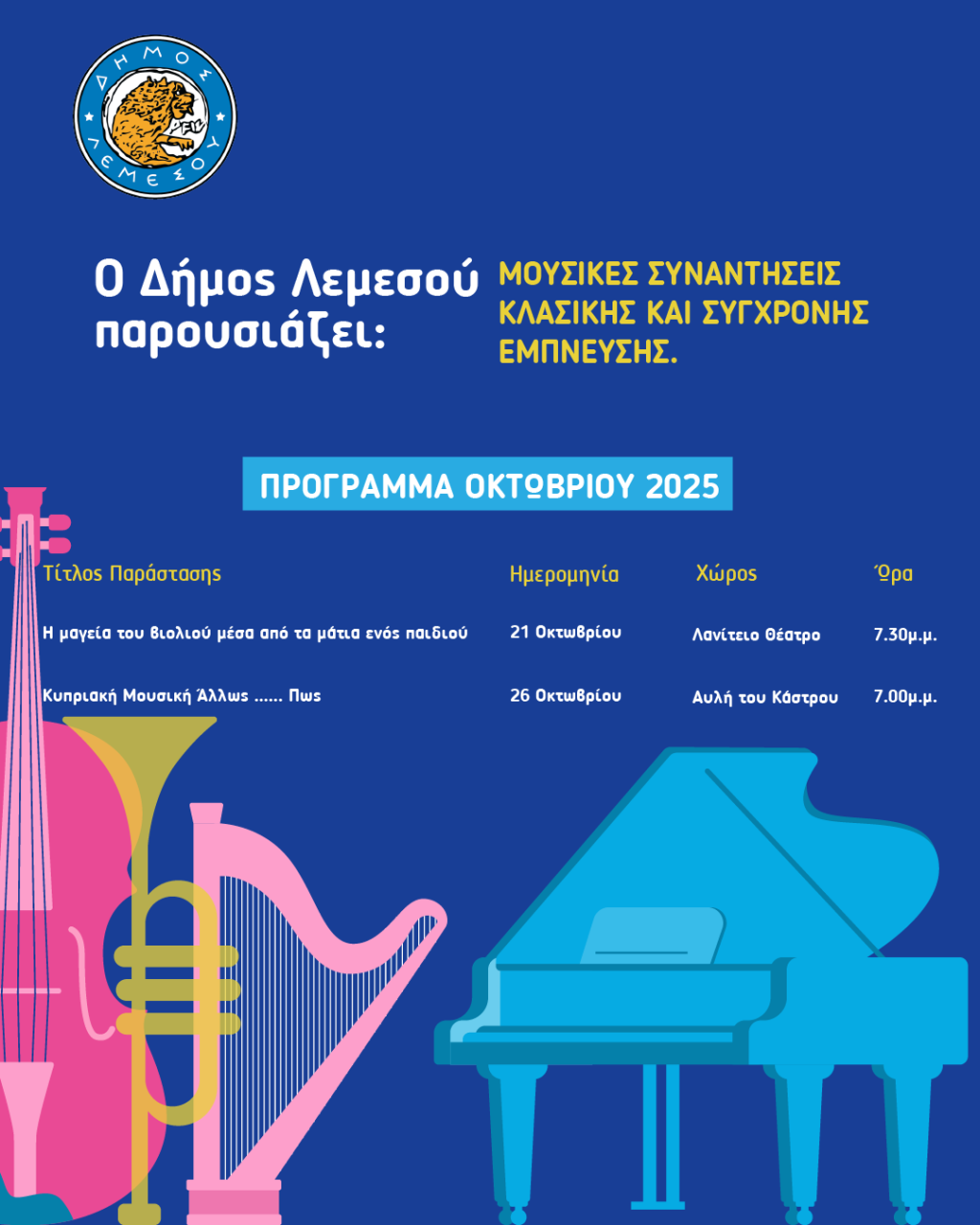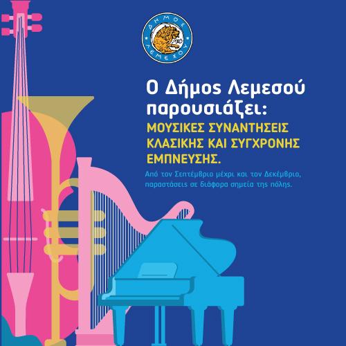 Έναν νέο πολιτιστικό θεσμό,  τις «Μουσικές Συναντήσεις – Κλασσικής και Σύγχρονης Έμπνευσης», εγκαινιάζει ο Δήμος Λεμεσού. Πρόκειται για έναν κύκλο μουσικών παραστάσεων που φιλοδοξεί να αποτελέσει σημείο αναφοράς για τη μουσική δημιουργία στη Λεμεσό και την Κύπρο.
