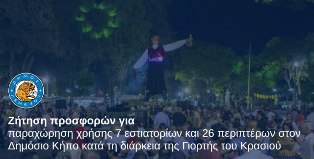 Ζήτηση προσφορών για παραχώρηση χρήσης 7 εστιατορίων και 26 περιπτέρων στον Δημόσιο Κήπο κατά τη διάρκεια της Γιορτής του Κρασιού