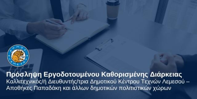 Ο Δήμος Λεμεσού ανακοινώνει  ό,τι γίνονται δεκτές αιτήσεις για απασχόληση ενός (1) εργοδοτουμένου ορισμένου χρόνου (Θέση Καλλιτεχνικού Διευθυντή /τριας  του Δημοτικού Κέντρου Τεχνών Λεμεσού – Αποθήκες Παπαδάκη και άλλων δημοτικών πολιτιστικών χώρων) Κλίμακα Α8 (μειωμένη κλίμακα εισδοχής). Οι ενδιαφ...