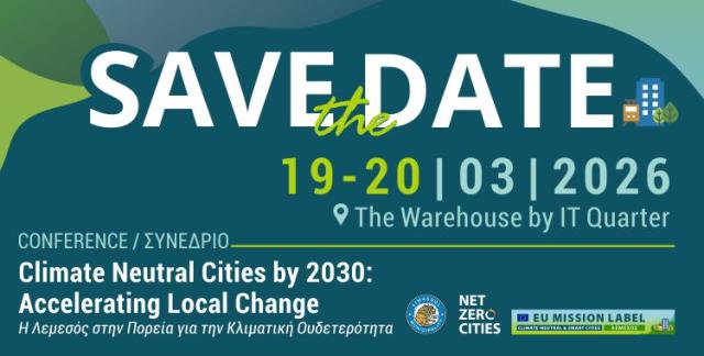 ΠΟΤΕ: 19-20 Μαρτίου 2026 ΠΟΥ:  The Warehouse by IT Quarter (http://bit.ly/469FDsG) Το συνέδριο αποτελεί μια πρωτοβουλία του Δήμου Λεμεσού στο πλαίσιο της συμμετοχής του στην Ευρωπαϊκή Αποστολή για 100 Κλιματικά Ουδέτερες και Έξυπνες Πόλεις έως το 2030. Το συνέδριο διοργανώνεται από τον Δήμο Λεμεσ...