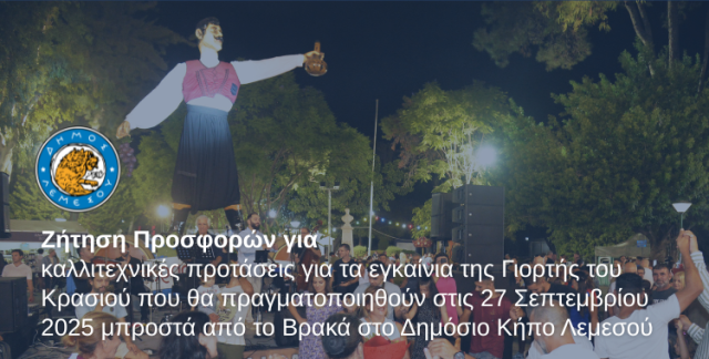 Ζήτηση Προσφορών για καλλιτεχνικές προτάσεις για τα εγκαίνια της Γιορτής του Κρασιού που θα πραγματοποιηθούν στις 27 Σεπτεμβρίου 2025 μπροστά από το Βρακά στο Δημόσιο Κήπο Λεμεσού