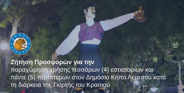Ο Δήμος Λεμεσού ζητά προσφορές από ενδιαφερόμενους για παραχώρηση χρήσης τεσσάρων (4) εστιατορίων και πέντε (5) περίπτερων στον Δημόσιο Κήπο Λεμεσού κατά τη διάρκεια της Γιορτής του Κρασιού, η οποία θα διεξαχθεί από 27/09/2025 μέχρι 05/10/2025 Για περισσότερες πληροφορίες μπορείτε να απευθυνθείτε σ...