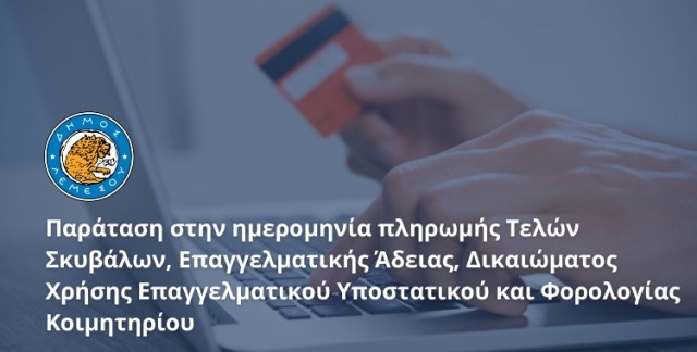 Ο  Δήμος Λεμεσού ανακοινώνει ότι έχει δοθεί παράταση στην ημερομηνία πληρωμής των λογαριασμών Τελών Σκυβάλων, Επαγγελματικής Άδειας, Δικαιώματος Χρήσης Επαγγελματικού Υποστατικού και Φορολογίας Κοιμητηρίου για το έτος 2023 μέχρι τις 29 Δεκεμβρίου 2023. Η πληρωμή γίνεται στα γραφεία εισπράξεως φόρων...