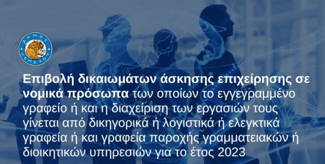 Ενόψει της  απόφασης της Ένωσης Δήμων ημερομηνίας 13.10.2020 (δείτε εδώ την απόφαση) σχετικά με τον καθορισμό ενιαίας πολιτικής για την επιβολή δικαιωμάτων άσκησης επιχείρησης σε νομικά πρόσωπα των οποίων το εγγεγραμμένο γραφείο ή και η διαχείριση των εργασιών τους γίνεται από δικηγορικά ή λογιστικά...