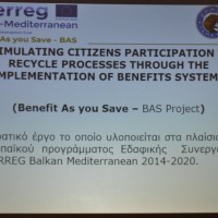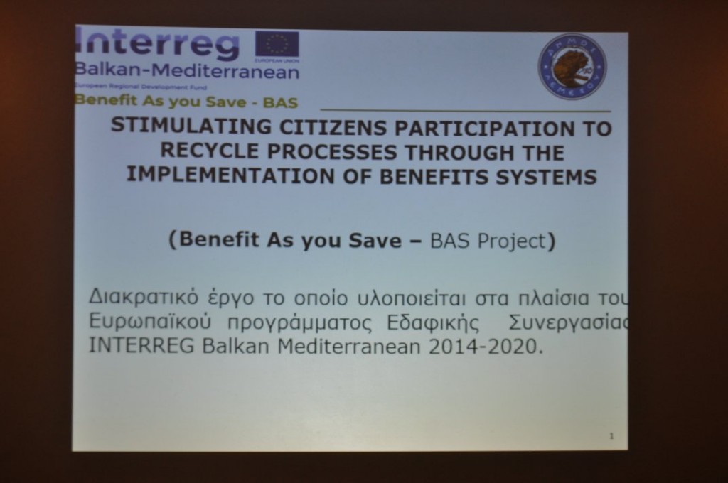 The Information Day for the European project “Stimulating Citizens Participation to Recycle Processes through the Implementation of Benefits Systems – Benefit As you Save – BAS” was successfully held on 7 June 2018 at the Kapetanios Odysseia hotel within the framework of the European Program “INTERREG BalkanMed 2014-2020”.