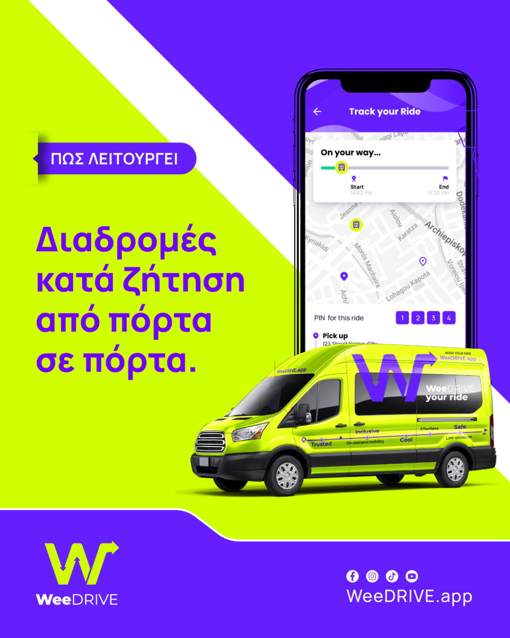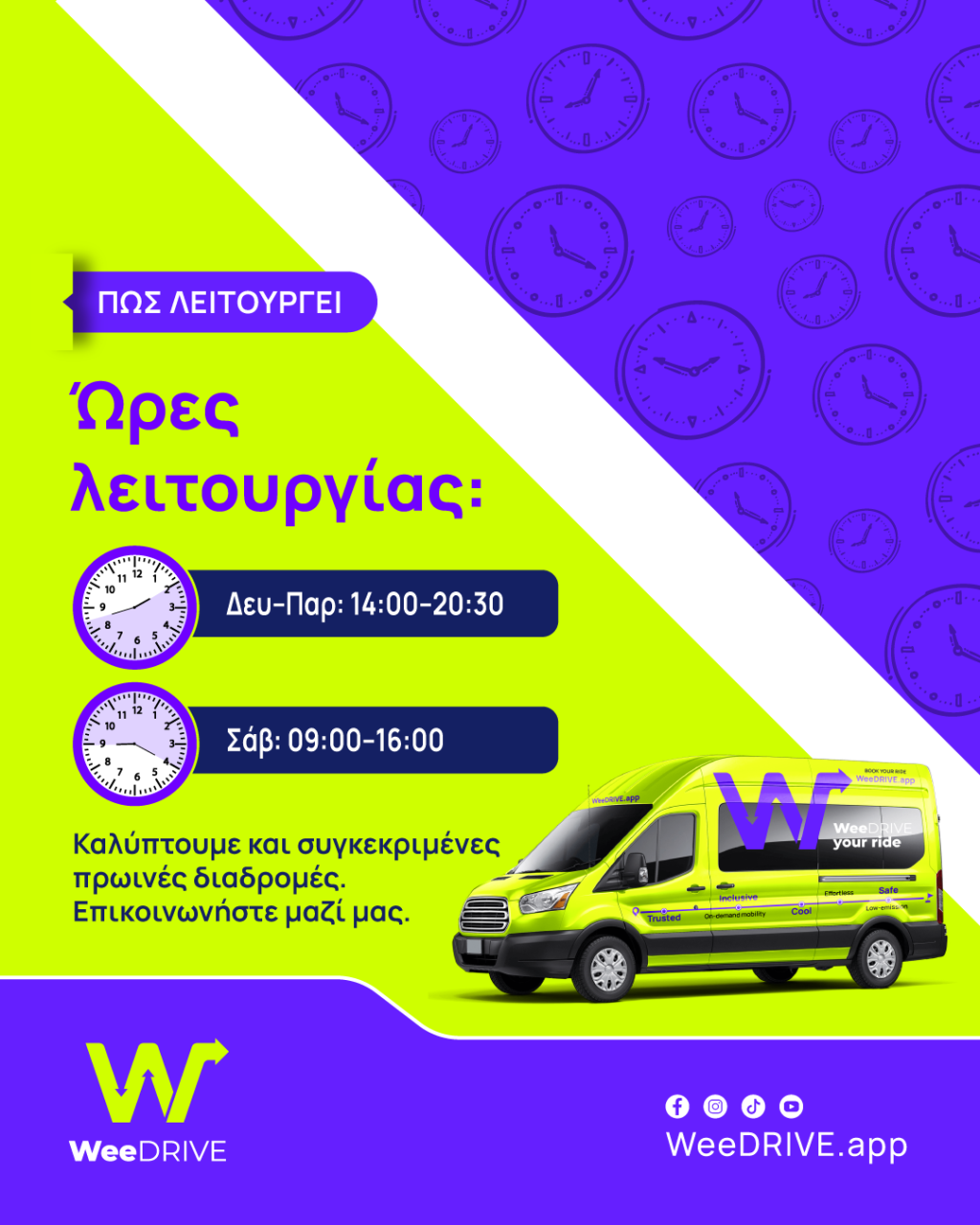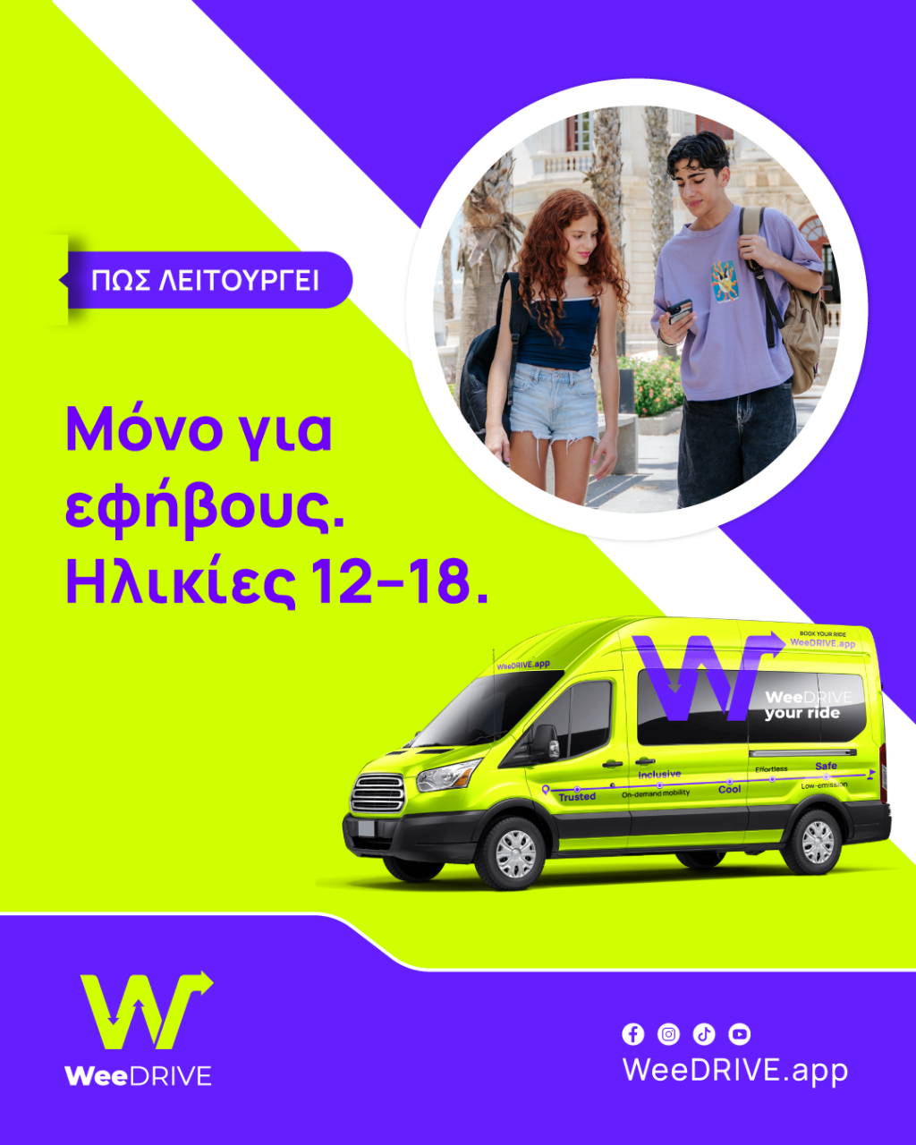 Για περισσότερες πληροφορίες και για να γνωρίσετε την υπηρεσία, επισκεφθείτε την ιστοσελίδα: weedrive.app, κατεβάστε την εφαρμογή και εξασφαλίστε στα παιδιά σας ασφαλή και άνετη μετακίνηση.