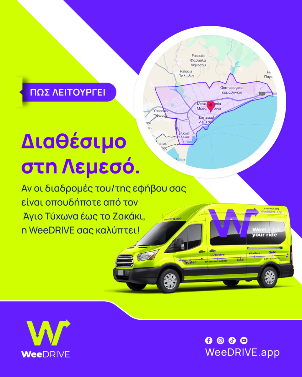 Η Λεμεσός υποδέχεται το WeeDRIVE, την πρώτη εφαρμογή στην Κύπρο που προσφέρει ασφαλείς και έξυπνες μετακινήσεις αποκλειστικά για εφήβους, 12 μέχρι 18 χρονών. Μέσω mini-buses 17 θέσεων, ενημερώσεις σε πραγματικό χρόνο για γονείς και τεχνολογίας αιχμής, το WeeDRIVE προσφέρει στους εφήβους την ελευθερία να μετακινούνται με υπευθυνότητα και στους γονείς την ηρεμία ότι τα παιδιά τους φτάνουν έγκαιρα και με ασφάλεια στις απογευματινές και Σαββατιάτικες τους δραστηριότητες.