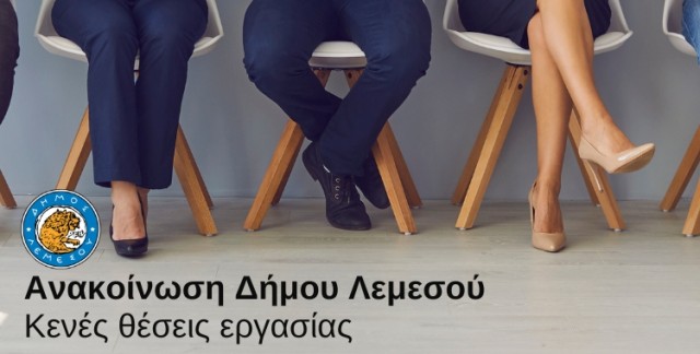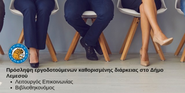 Ο Δήμος Λεμεσού ανακοινώνει  ό,τι γίνονται δεκτές αιτήσεις για απασχόληση δυο (2) εργοδοτουμένων  ορισμένου χρόνου. ΛΕΙΤΟΥΡΓΟ ΕΠΙΚΟΙΝΩΝΙΑΣ - Κλίμακα Α8 (μειωμένη κλίμακα εισδοχής) ΒΙΒΛΙΟΘΗΚΟΝΟΜΟ - Κλίμακα Α8 (μειωμένη κλίμακα εισδοχής) Οι ενδιαφερόμενοι μπορούν να ενημερωθούν μέσω των πιο πάν...