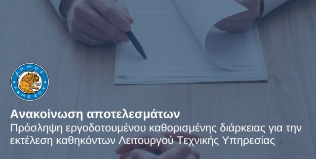 Ανακοίνωση αποτελεσμάτων - Πρόσληψη εργοδοτουμένου καθορισμένης διάρκειας για την εκτέλεση καθηκόντων Λειτουργού Τεχνικής Υπηρεσίας